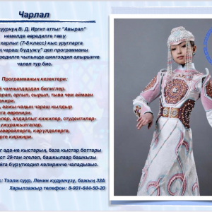 ЧарлалТээли суурнуң В. Д. Иргит аттыг «Авырал» немелде өөредилге төву 13-14 харлыг (7-8 класс) кыс уругларга «Кыстың чараш бүдүжү» деп программаны 2023-2024 өөредилге чылында шиңгээдип алырынче чалап тур бис. Адрезивис: Тээли суур, Ленин…
