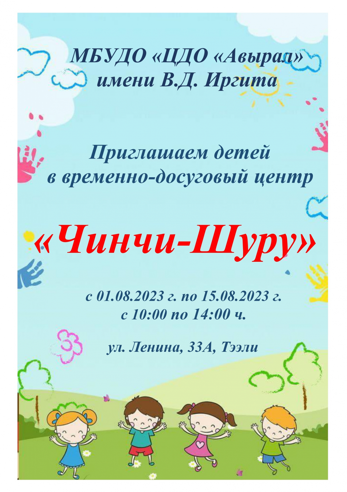 С 01 по 15 августа 2023 года МБУДО «ЦДО»Авырал» им. В.Д.Иргита» открывает временно-досуговый центр «Чинчи-Шуру». Приглашаем всех желающих детей с пользой провести время. Педагоги проведут беседы, спортивные игры, викторины, а также различные конкурсы.