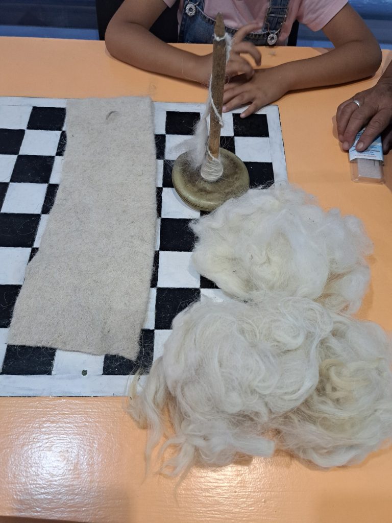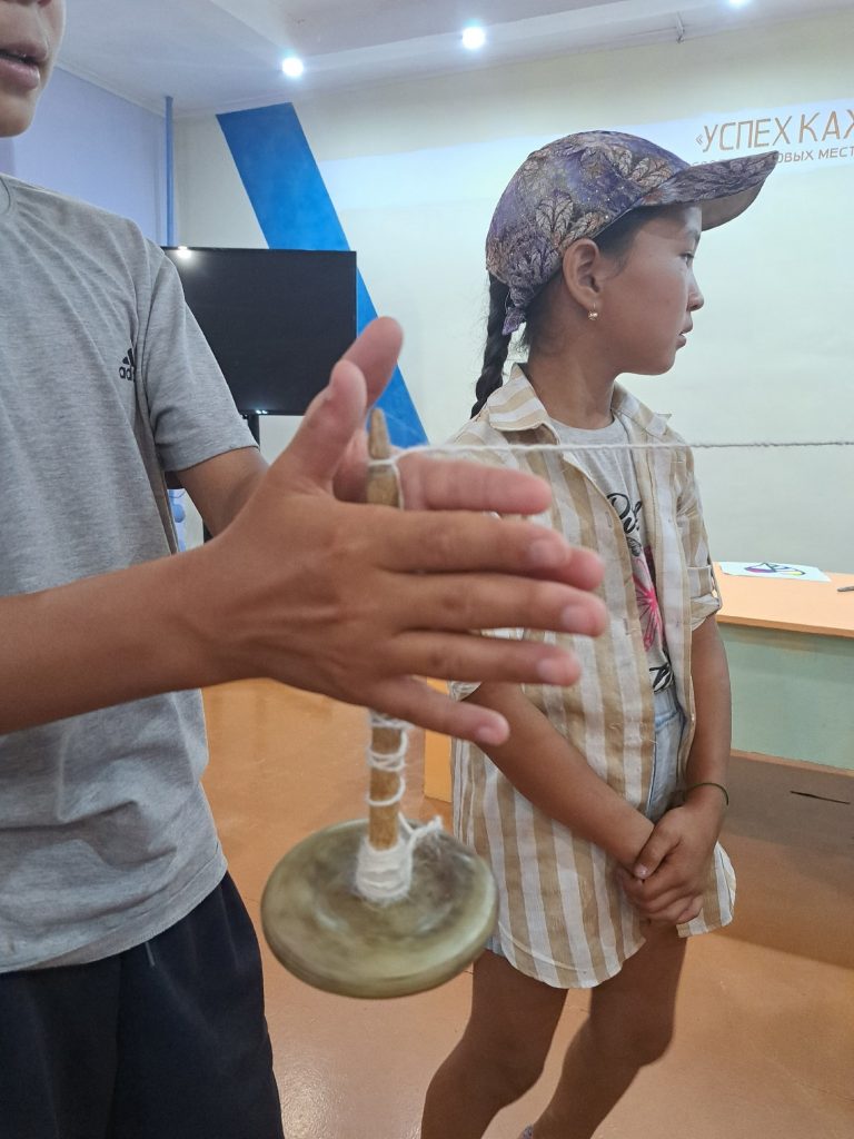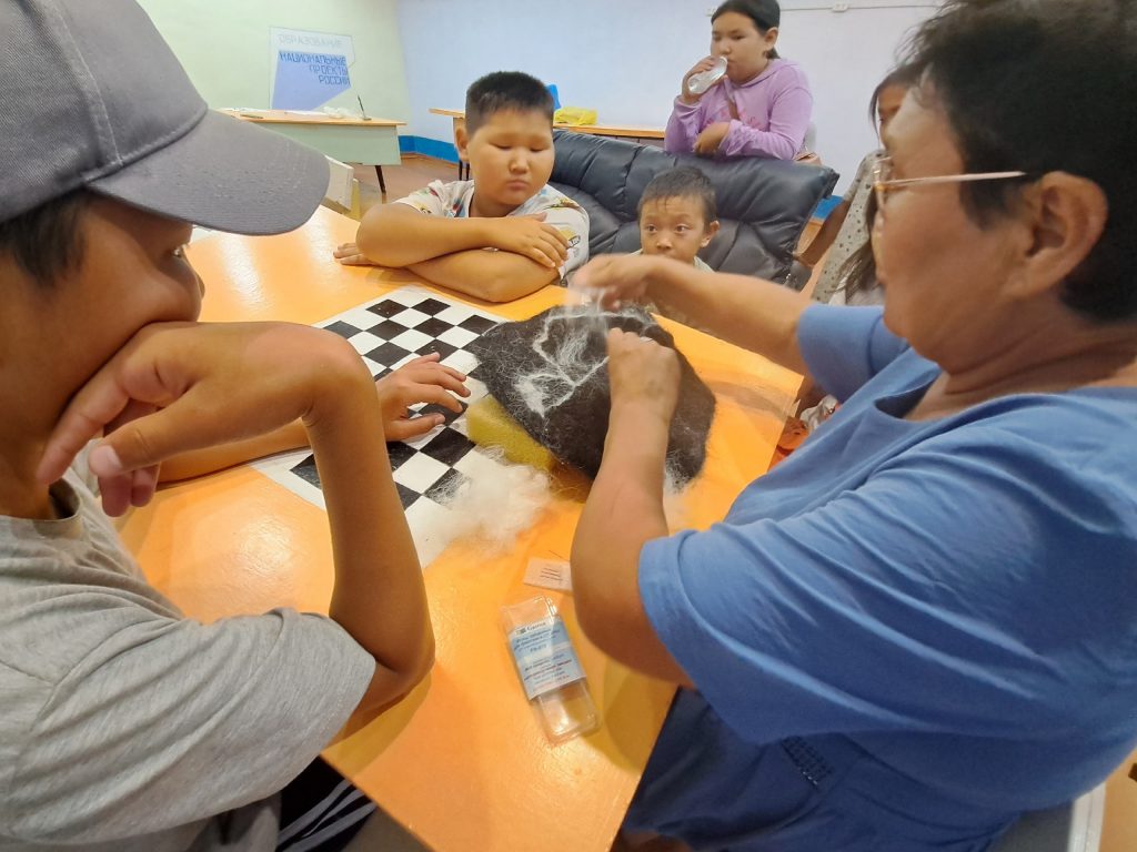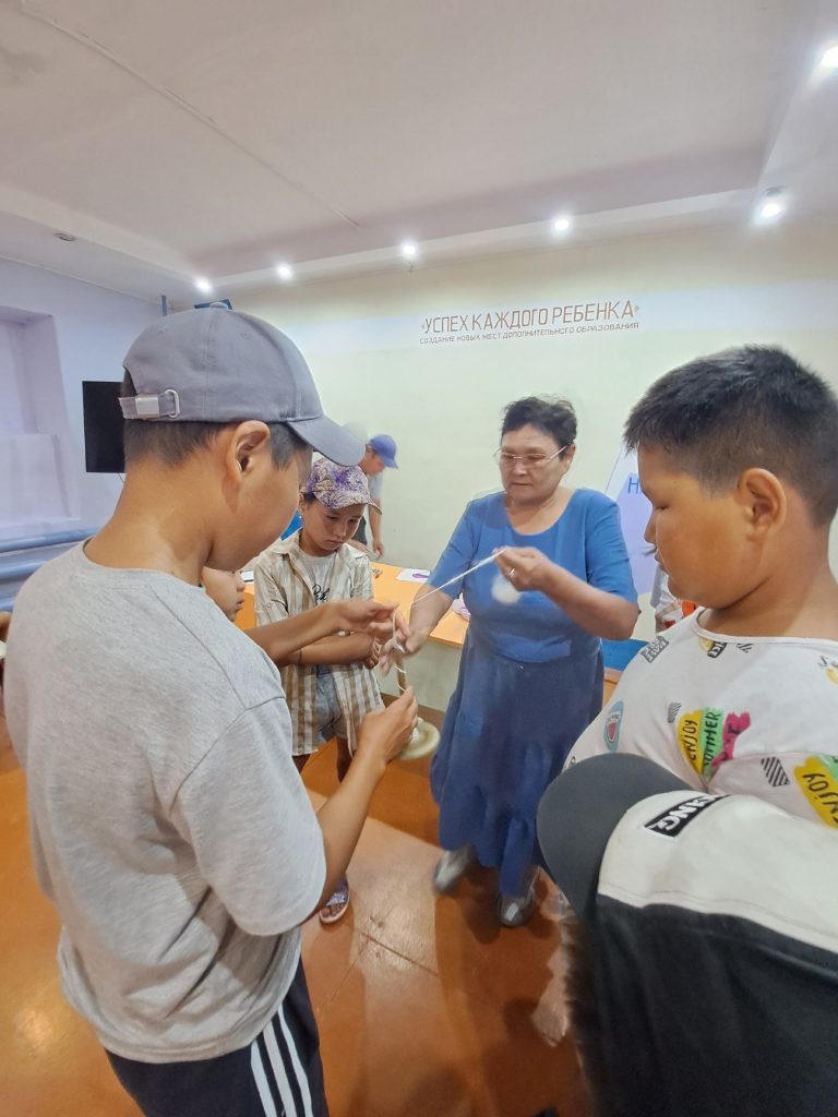 — Мастер-класс на тему «Сухое валяние шерсти». Педагоги ознакомили с инструментом предков «Ээргииш» (веретено) по прядению шерсти, который вызвал большой интерес детей, они даже попробовали прясти на ээргииш. Всего охвачено 15 детей.