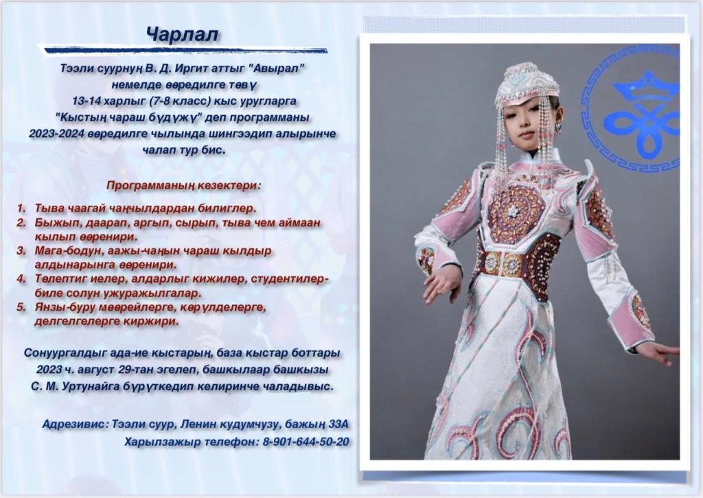Тээли суурнуң В. Д. Иргит аттыг «Авырал» немелде өөредилге төву 13-14 харлыг (7-8 класс) кыс уругларга «Кыстың чараш бүдүжү» деп программаны 2023-2024 өөредилге чылында шиңгээдип алырынче чалап тур бис.