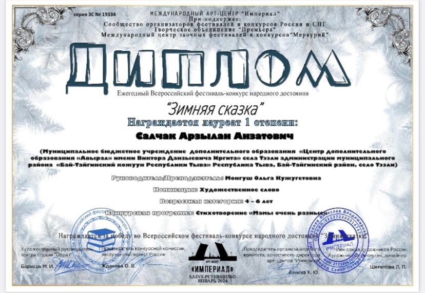 Салчак Арзылан Анзатович — лауреат 1 степени