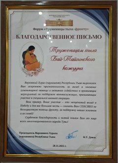 Председатель Верховного хурала Республики Тыва Даваа Кан-оол Тимурович вручил благодарственные письма за помощь нашим защитникам.