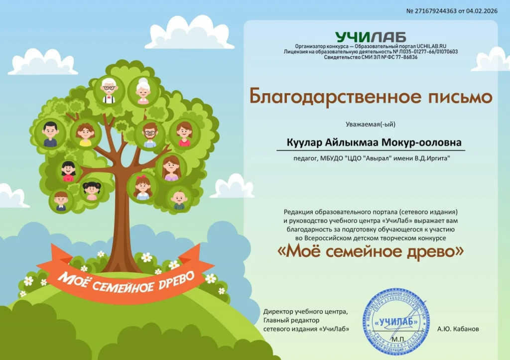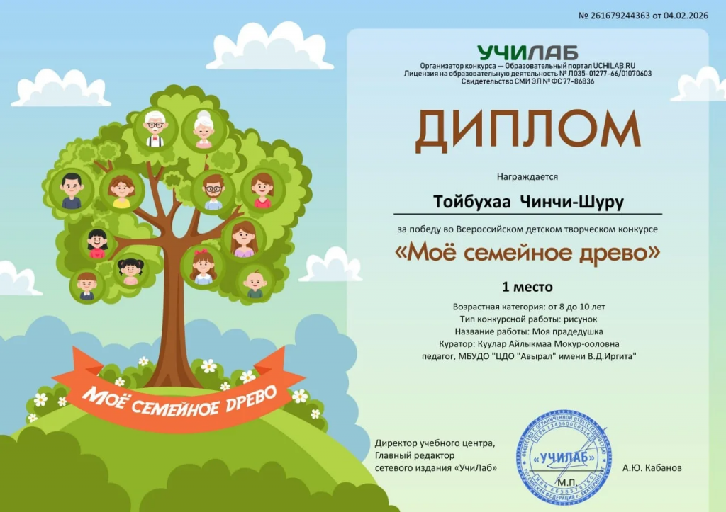 Участница объединения «Домисолька» Центра дополнительного образования «Авырал» имени В.Д. Иргита Тойбухаа Чинчи-Шуру, под руководством педагога Куулар Айлыкмаа Мокур-ооловны, завоевала первое место во Всероссийском детском конкурсе «Мое семейное древо» в номинации «Рисунок». Уже с раннего возраста девочка проявляет интерес к изобразительному искусству — рисование стало не просто хобби, а настоящим выражением её внутреннего мира. Личность у неё творческая, чуткая, спокойная, обладает глубокой эмоциональностью и чувством гармонии. Каждая работа отражает индивидуальность, внимание к деталям и любовь к родному краю. Её картины поражают выразительностью композиции, выдержкой цветового решения и пространственной выразительностью. Поздравляем победителя с достойным достижением! Желаем ей дальнейшего развития, вдохновения, новых проектов и уверенности в своих силах.