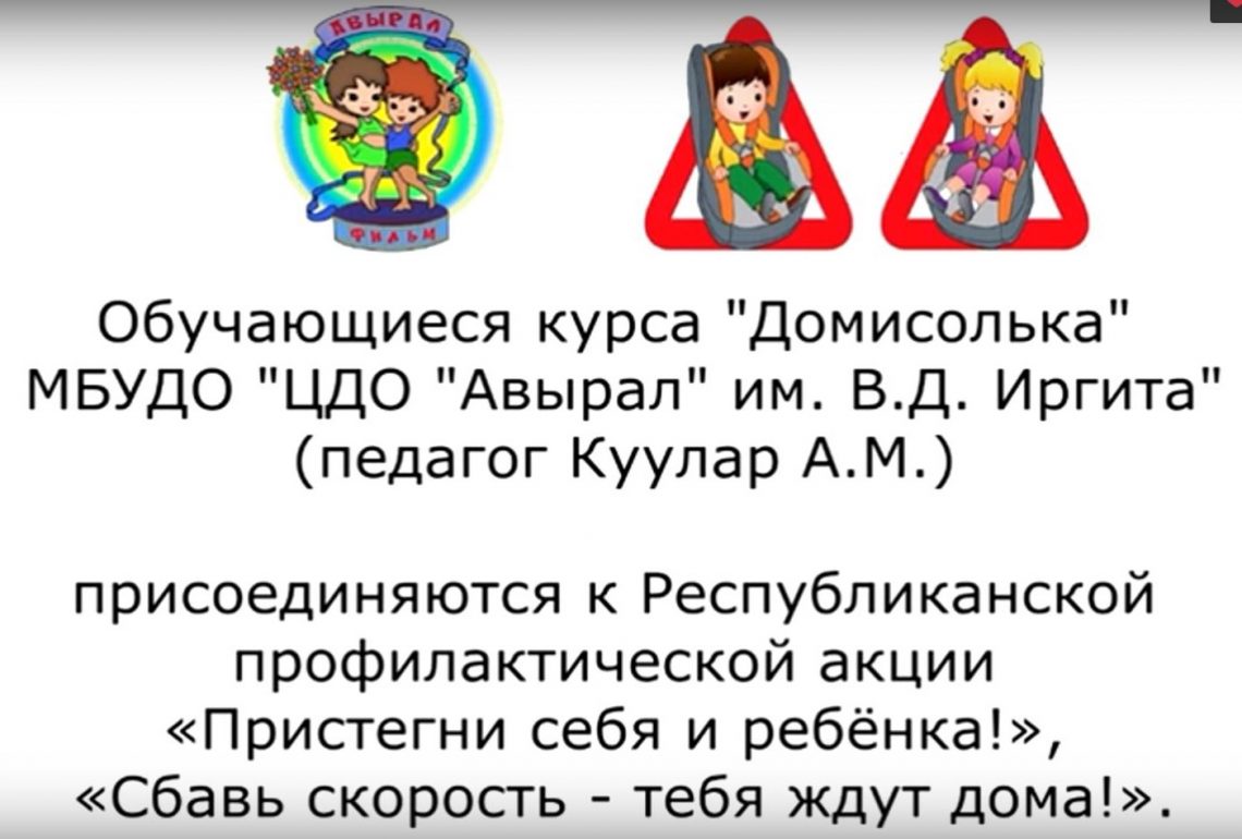 Обучающиеся курса «Домисолька» МБУДО «ЦДО «Авырал» им В. Д. Иргита» (педагог Куулар А. М.) присоединяются к Республиканской профилактической акции «Пристегни себя и ребёнка!», «Сбавь скорость — тебя ждут дома!».